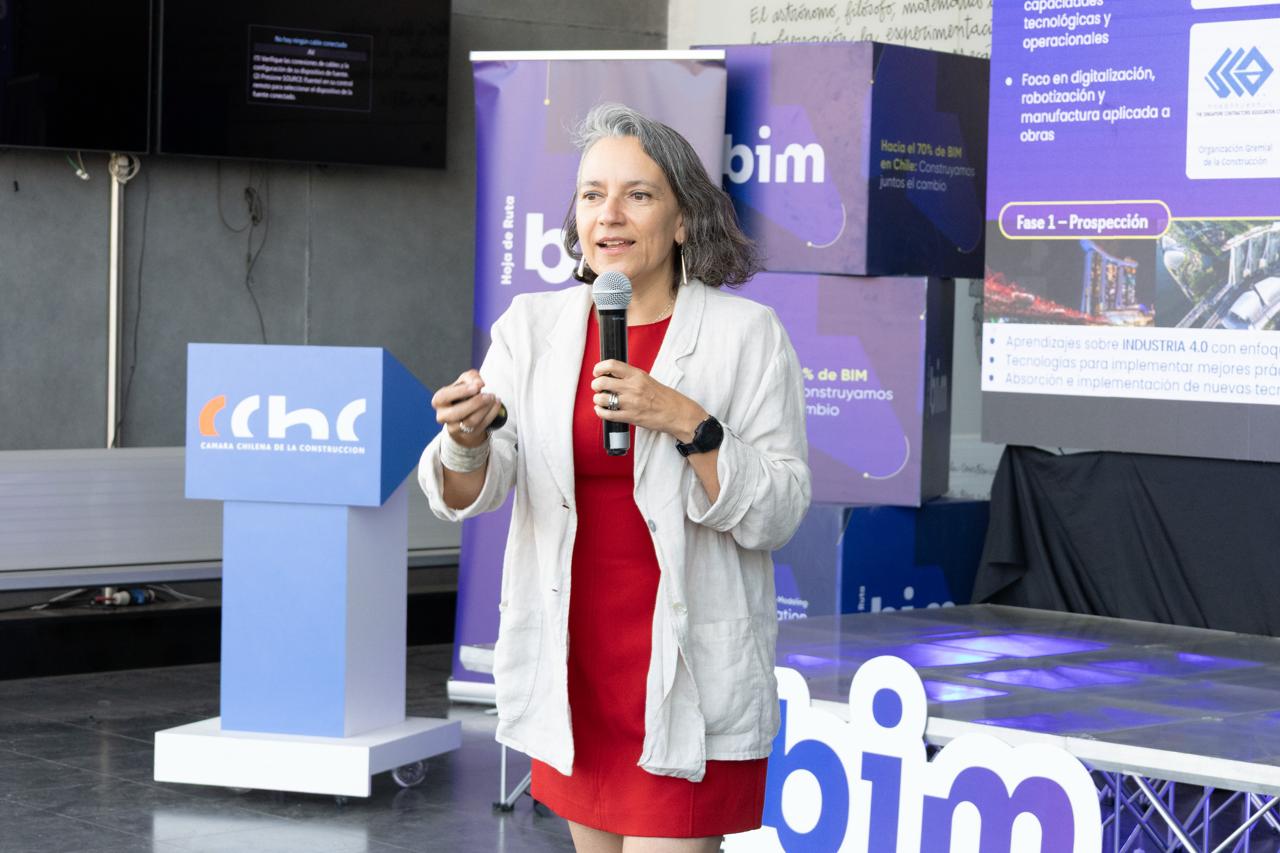 Un último grupo que se destacó en el evento fue el de Fomento, con detalles de la acción 13 sobre la Misión a Singapur. En la oportunidad, Nicolás Geister, vicepresidente del Comité de Especialidades, BIM MGMT – Coordinador BIM y miembro de la Aceleradora BIM CChC, detalló algunas de las lecciones generales aprendidas sobre productividad, transformación digital e industrialización durante el viaje. Complementando lo anterior, Carolina Briones, directora ejecutiva de CTEC, quien también participó en la misión al país asiático, abordó algunos de los principales hallazgos, relacionados con: transformación digital (Adopción BIM impulsada por el Estado, con requerimientos y estándares alineados a buildingSMART Singapur), políticas gubernamentales (promueven la tecnología y estandarización en los proyectos), innovación, tecnología e IA (universidades impulsan innovación: robótica, automatización y sensores para monitoreo en tiempo real) e industrialización y DFMA.