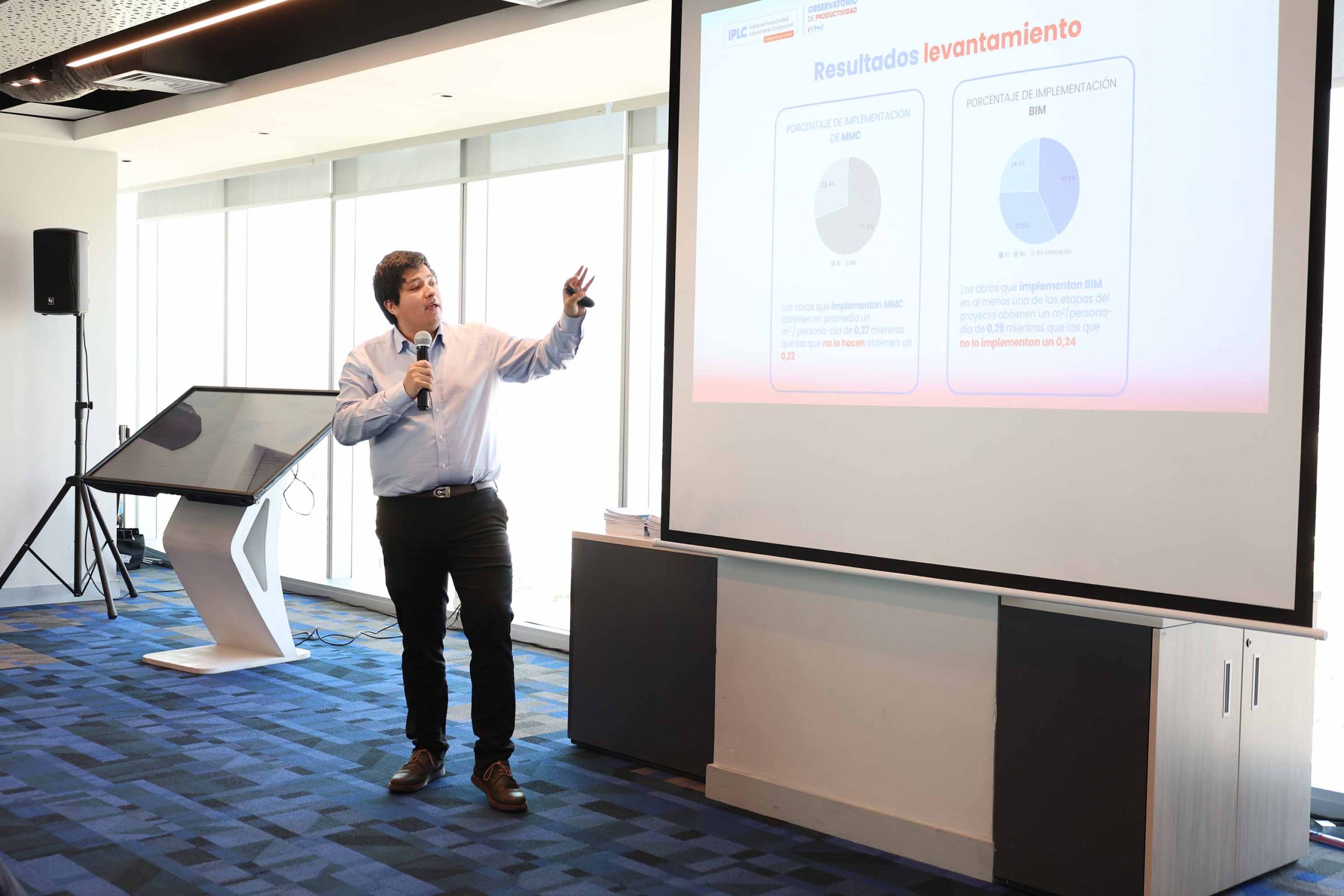 Leonardo Caamaño, coordinador de proyectos de productividad de la CDT, y Javiera Gómez, profesional de proyectos de productividad, presentaron los resultados del IPLC, que se centró en la edificación en altura (mayor a cuatro pisos) debido a la existencia de una línea base de comparación (estudio Matrix 2020). El levantamiento incluyó 74 proyectos terminados entre 2023 y 2024, con la participación de 25 empresas. El periodo de análisis para la productividad abarcó desde el inicio de las fundaciones hasta la recepción del mandante.